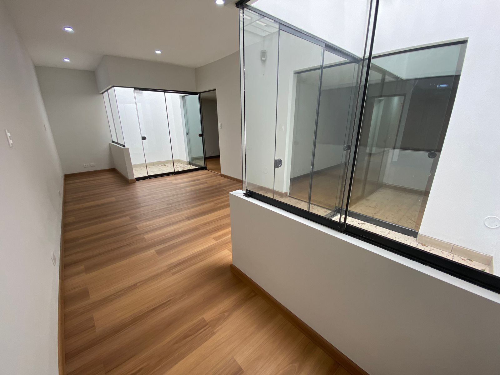 - Sala de tv con mueble de tv de madera , esta sala tiene una zona que permite el ingreso de luz y ventilación además de servir como una linda jardinera decorativa.