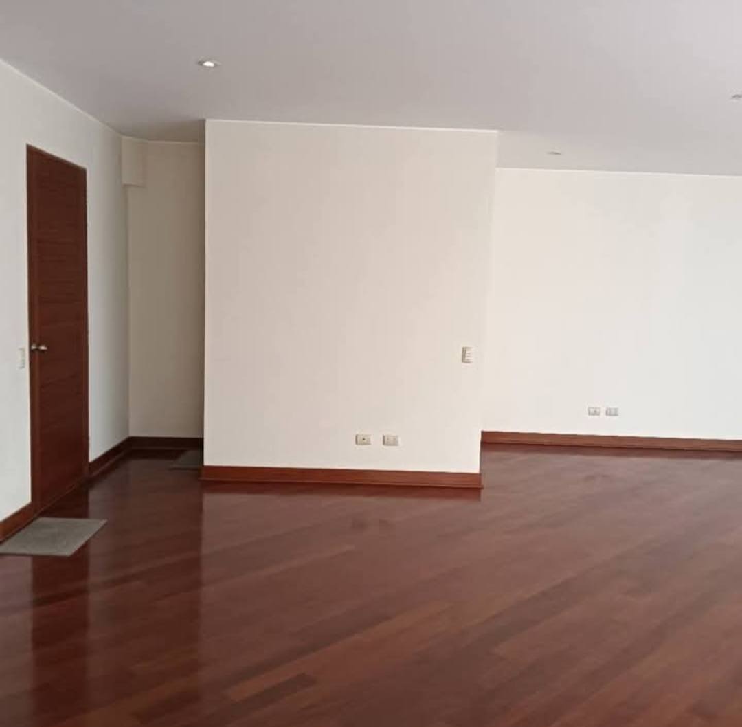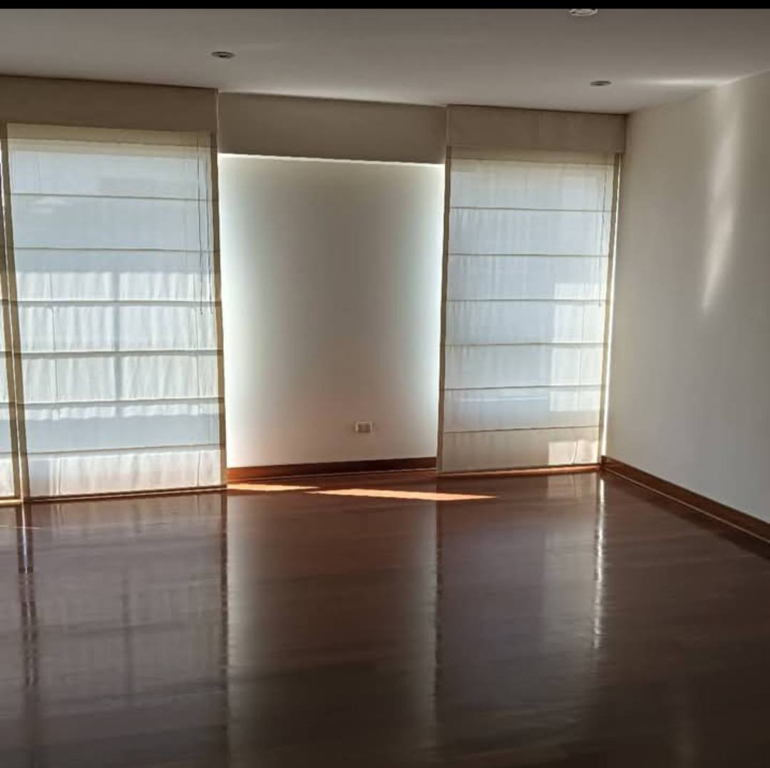 El departamento tiene muy poco uso y parece de estreno. Es muy iluminado y ventilado, mide 120 m2, tiene pisos de madera, ultra moderno baño de visitas, amplia sala comedor con grandes ventanales de piso a techo, cocina con estupendos reposteros altos y bajos y mesadas de granito pulido, campana, conexión para gas central o solo usar balón, lavandería con instalación para lavadora secadora, cuarto y baño de servicio. 2 dormitorios con excelentes closets y 2 baños completos. 1 de los baños está en incorporado al dorm. principal que tiene, además, un lindo y amplio balcón como para desayunar en verano. La vista es linda desde todas partes.
