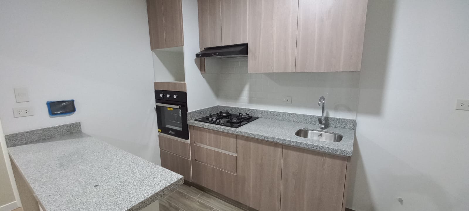 Cocina amoblada con cocina encimera, horno y campana extractora