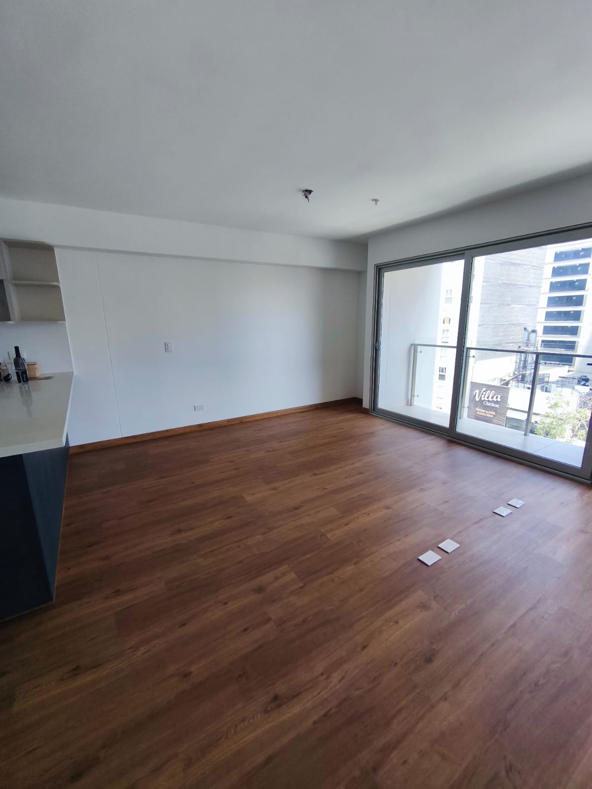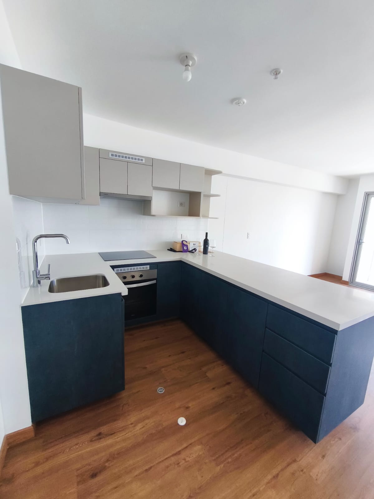 Cocina abierta equipada: Cocina, campana, horno. Tablero de cuarzo, barra amplia.